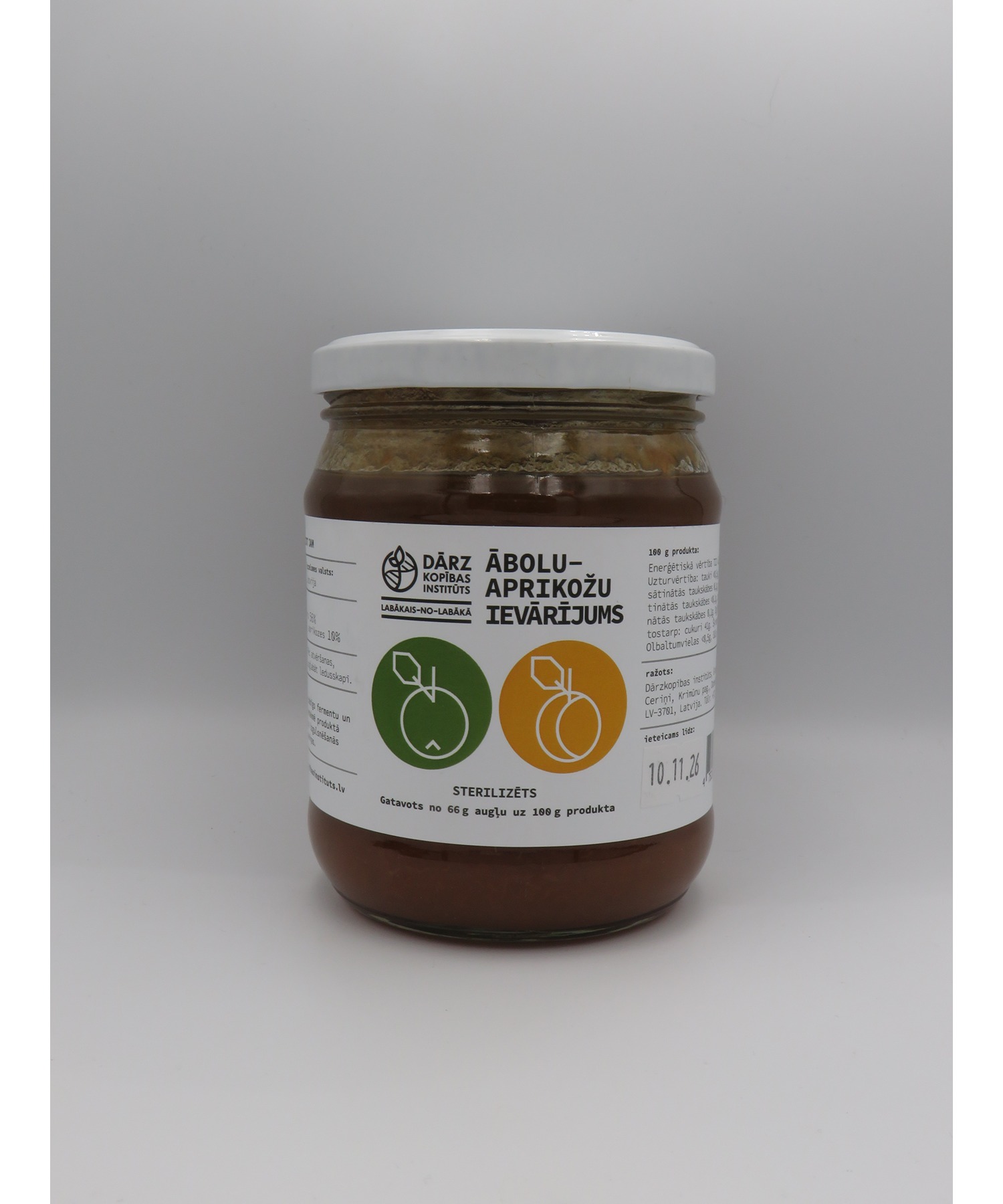 Ievārījums, pagatavots no Latvijā audzētiem āboliem un aprikozēm pēc receptūras, kuras sastāvdaļas ir tikai augļi un cukurs.