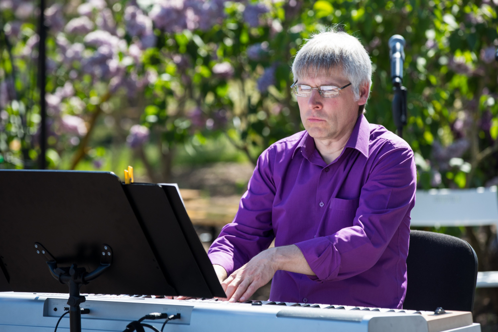Dzejas lasījumi Ceriņu dārzā Ceriņu dārzā uzstājas Jaunā Rīgas teātra aktieris Kaspars Znotiņš un pianists Valdis Tensons 25. maijā 2018. gadā. Fotogrāfiju autors: Agris Šiliņš