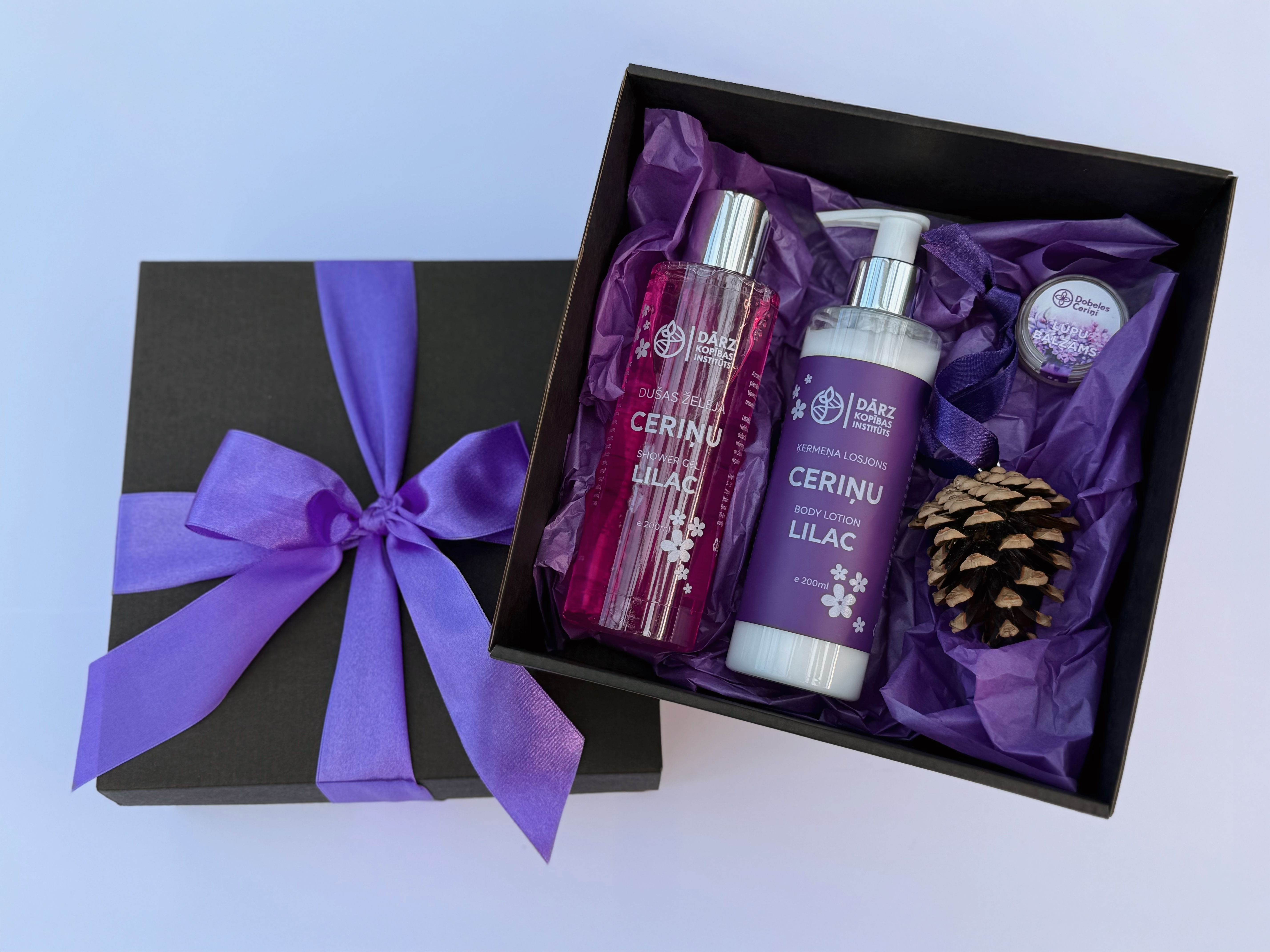 Dušas želeja ar ceriņu aromātu, ķermeņa losjons ar ceriņu aromātu un lūpu balzams skaistā iepakojumā - gatavs dāvināšanai